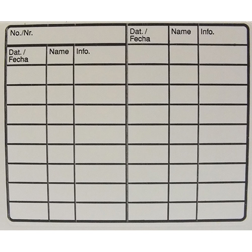 Etykieta samoprzylepna do prowadzenia zapisów wewnątrz stacji. Na etykiecie znajduje się miejsce do wprowadzenia zapisu: nr urządzenia, daty sprawdzenia, inicjałów prawdzającego, informacji o aktywności.Jedna etykieta zawiera 17 linii do zapisu. Wymiar etykiety 6 x 5 cm. Opakowanie zawiera 5 arkuszy po 10 naklejek.