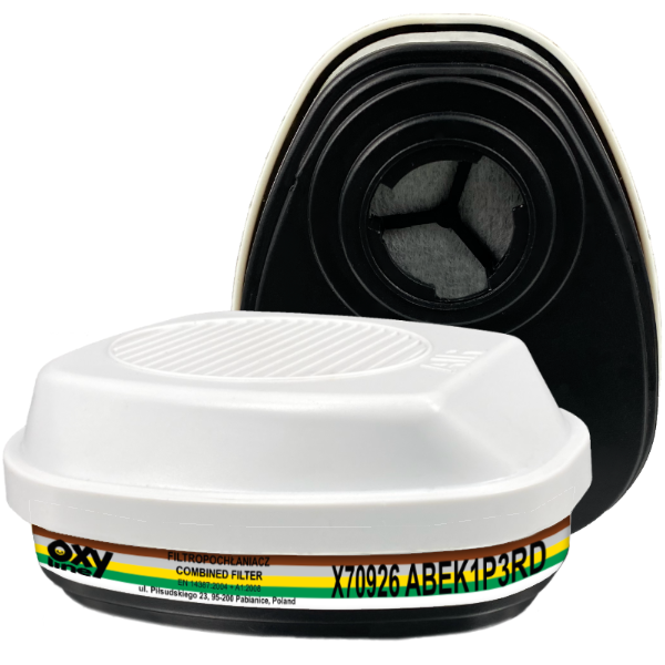 Pochłaniacz X70926 ABEK1P3 chroni przed organicznymi parami i gazami, o temperaturze wrzenia powyżej 65°C (kolor brązowy), nieorganicznymi parami i gazami, z wyjątkiem tlenku węgla (kolor szary), dwutlenkiem siarki oraz parami i gazami kwaśnymi (kolor żółty), amoniakiem oraz pochodnymi amoniaku (kolor zielony) przy stężeniu objętościowym w powietrzu nie przekraczającym 0,1% oraz przed pyłami, dymami i mgłami. Konstrukcja odchylna do tyłu zapewnia lepsze pole widzenia. Pochłaniacz X70926 ABEK1P3 posiada złącze bagnetowe pozwalające na łączenie z półmaskami serii X6 i X7 oraz maskami serii X8. Nie używać w środowisku, w którym stężenie tlenu jest mniejsze niż 19,5% oraz w obecności nieznanych gazów. Przechowywać w oryginalnym opakowaniu wraz z instrukcją, bez podłączonych elementów oczyszczających w temperaturze od -20°C do +30°C i wilgotności RH<80%. Chronić przed bezpośrednim działaniem światła słonecznego.