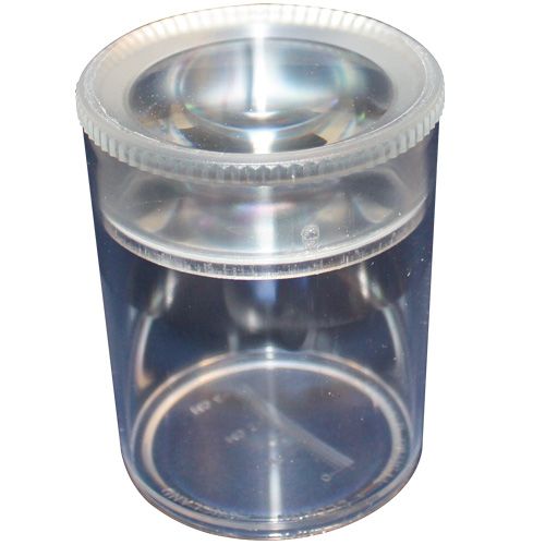 Cylindryczny pojemnik z przykrywką do identyfikacji owadów, wykonany z przeźroczystego tworzywa sztucznego. Pokrywa zintegrowana jest z lupą oferującą powiększenie 4,75 x. Średnica pojemnika 5 cm, wysokość 7 cm.