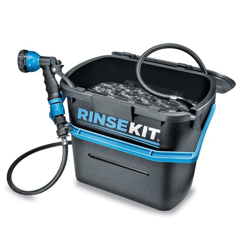 Zestaw do zraszania RinseKit oferuje strumień wody pod ciśnieniem, bez konieczności pompowania czy zasilania bateryjnego. RinseKit może być szybko napełniany gorącą lub zimną wodą z kranu lub baterii zlewu (z adaperem). Opatentowane urządzenie RinseKit dysponuje zbiornikiem na ponad 7 litrów wody, oraz dyszą o siedmiu różnych nastawach, od strumienia po prysznic. Lekka konstrukcja sprawia, że można go przenosić jedną ręką. Idealny do szybkiego umycia rąk, obuwia czy zabrudzonych narzędzi.